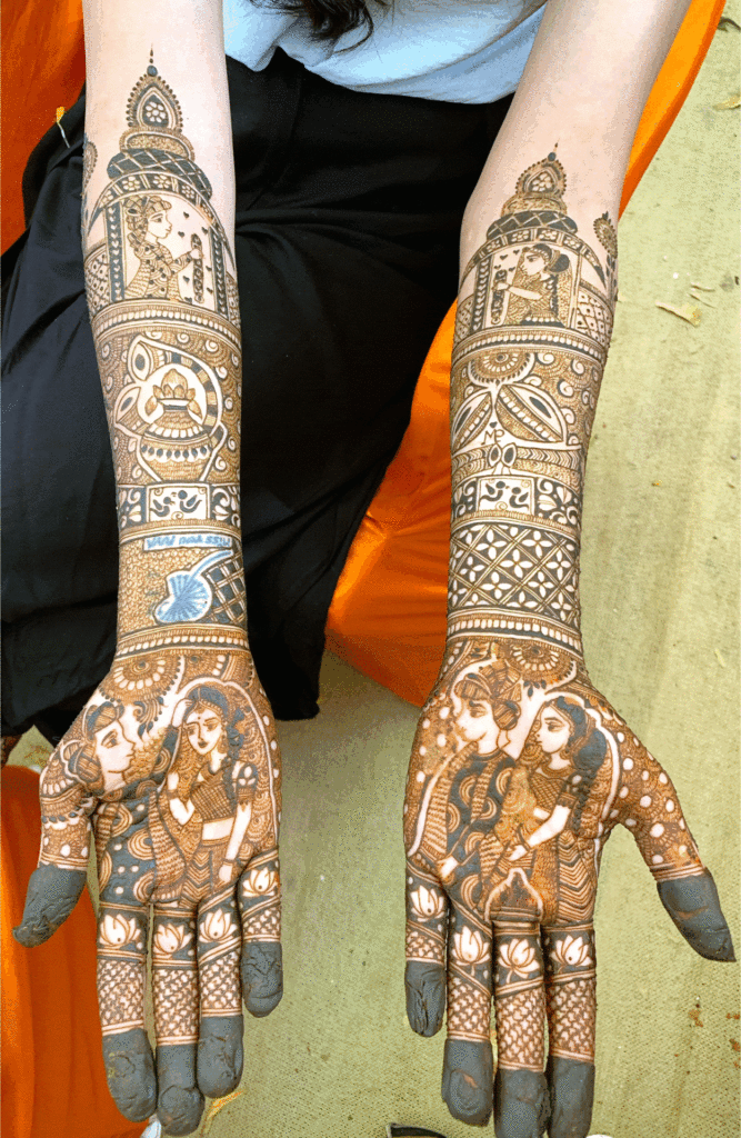 The color from the Mehandi begins to emerge within 24 hours, Gradually Developing into a Rich, Dark Stain over Time.