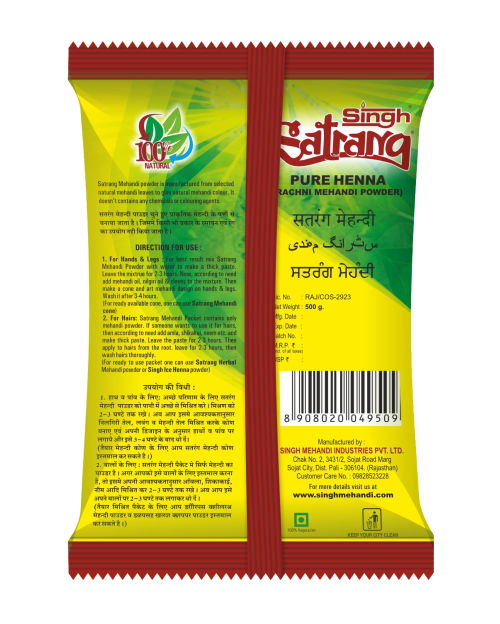 - Singh Satrang mehandi packet contains only mehandi powder. Make a paste of this powder with additional herbal ingredients like neem, aritha, etc., if required.