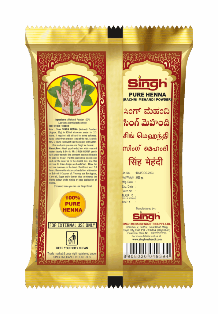 Quality Information : Singh Mehandi powder is manufactured from selected natural mehandi leaves to give natural mehandi color. It doesn’t contain any chemical or coloring agent.